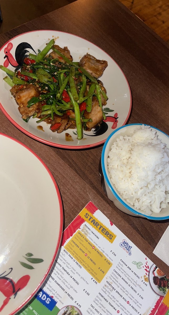 Pad Gra Pao with crispy belly pork Crispy belly pork Pad Pak Boong Fai Daeng with crispy belly pork Spice Thai Chow Mein